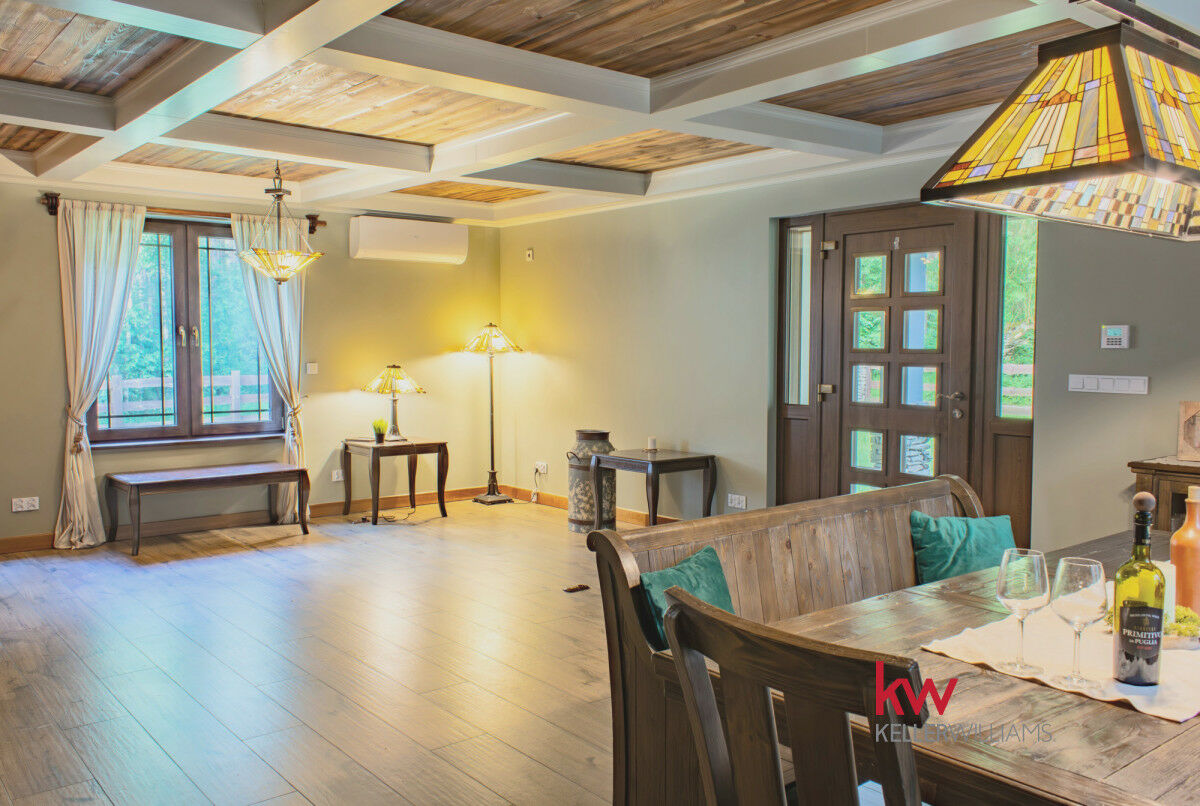 • Stylowe, wyjątkowe wnętrze z dużą ilością naturalnego drewna: drewniane schody, poręcze, drzwi, okna i widoczne belki sufitowe tworzą ciepły, przytulny klimat